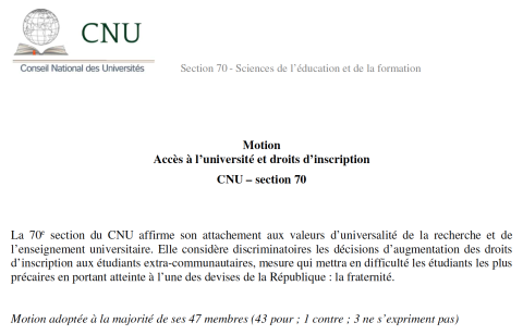 Motion de la 70ème section du CNU contre l’augmentation des frais d’inscription des étudiants extra-communautaires, 12 mars 2019 Article Image OLD ID public://image-inserer/motion_cnu_70.png